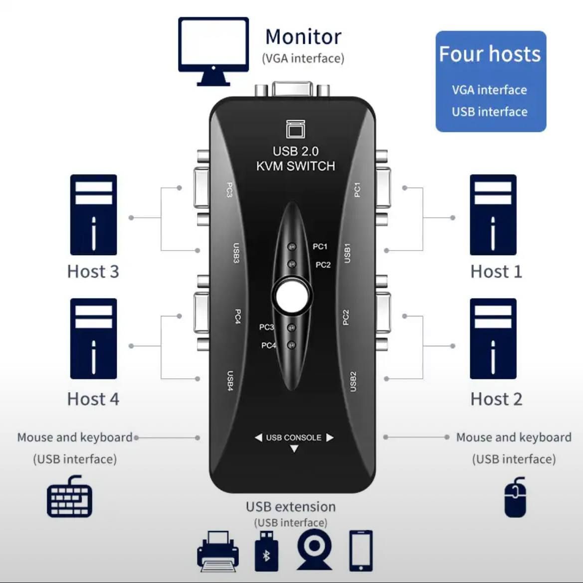 KVM переключатель дает возможность управления четырьмя компьютерами с помощью одного комплекта из монитора, клавиатуры и мыши. Клавиатура и мышь должны иметь USB разъем для подключения. Весьма экономичное решение, занимающее минимум места на вашем рабочем столе.