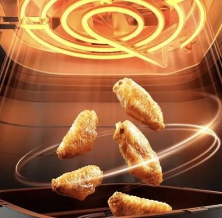 Аэрогриль объемом 6 литров обеспечивает равномерное приготовление пищи без необходимости переворачивания. В основе технологии лежит круговой нагрев и инновационная система вентиляции, что позволяет добиться идеально хрустящей корочки со всех сторон. Вентилятор оснащен 9-тью двукрылыми спиральными лопастями. Воздух циркулирует с максимальной скоростью 2350 об/мин. Это позволяет создать мощный поток горячего воздуха, который равномерно распределяет тепло по всей поверхности продуктов.
