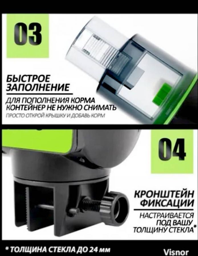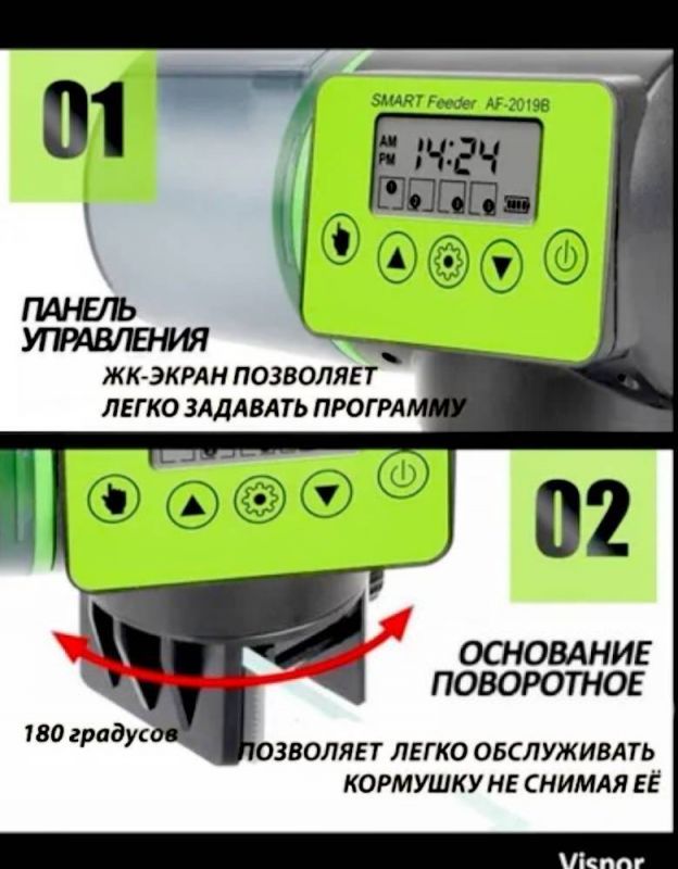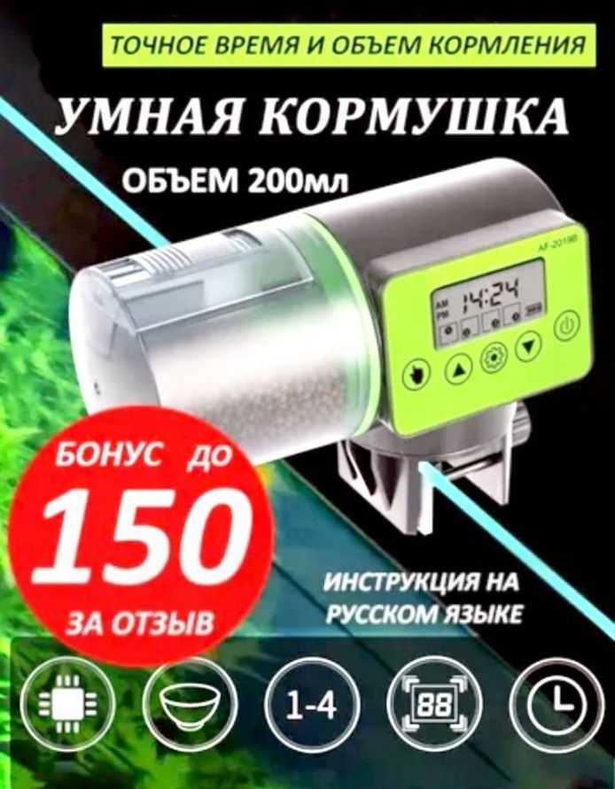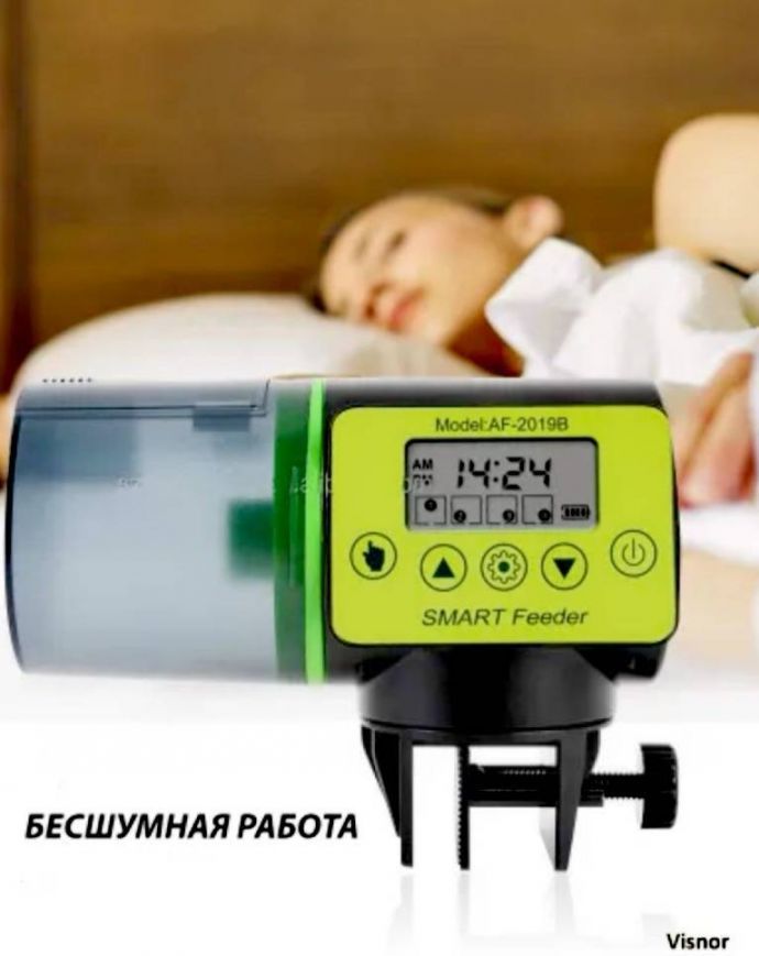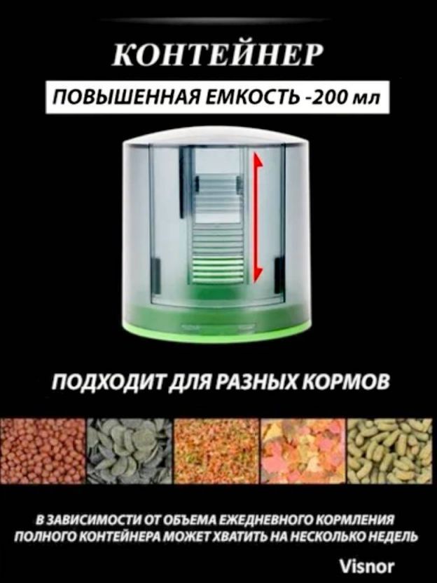 ДОСТОИНСТВА данной АВТОКОРМУШКИ: 1. ПОВЫШЕННЫЙ обьем контейнера для корма- 200мл 2. Бесшумная работа, рядом можно спокойно спать. 3. Позволяет настроить любое время кормления от 1 до 4 раз в сутки. 4. Возможность настроить обьем (порции) при кормлении. 5. Расчитан на различные виды сухих кормов (гранулы, хлопья, крупнозернистый порошок) 6. Наличие функции в ручного управления (вне плановое кормление). 7. Возможность 2-х видов крепления (на стенку или на крышу аквариума) 8. Инструкция на русском языке. 9. Красочная упаковка 10. Обратная связь с продавцом для решения всех возможных технических вопросов с кормушкой. - Электронная автоматическая кормушка для рыб - необходимый современный гаджет для всех любителей аквариумных рыб. ВЫ МОЖЕТЕ СПОКОЙНО ПОЕХАТЬ В ОТПУСК и не боятся за своих питомцев.