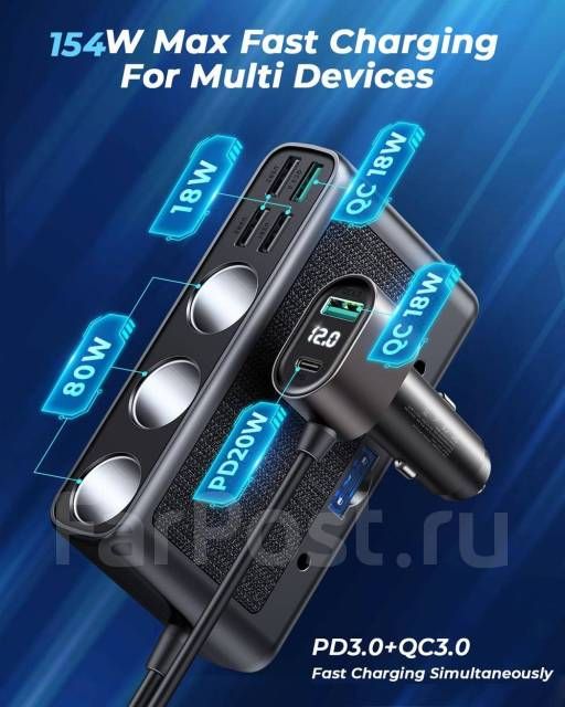1. Многопортовый автомобильный прикуриватель: дизайн цифрового экрана (белый свет), отображение напряжения без нагрузки/нагрузки в режиме реального времени, гарантия безопасной зарядки без повреждений.
