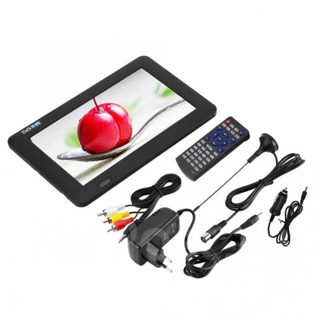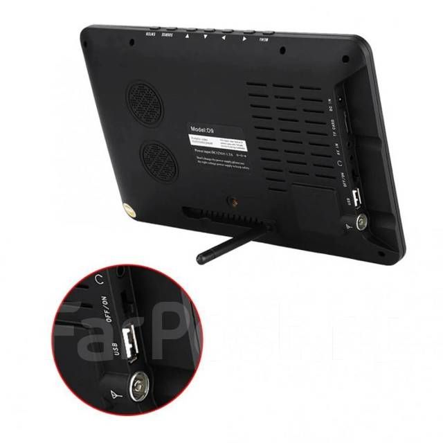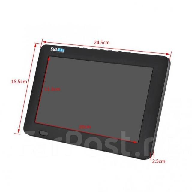 Мультимедийный цифровой ЖК-телевизор Процессор: MSTAR 3463 Solution Диагональ: 9" (22,9 см) Формат экрана: 16:9 Разрешение: 800x600 Частота обновления: 50 Гц Контрастность: 300:1 Угол обзора: 165° Размер телевизора: 24.5 х 15.5 х 1.8см Встроенный аккумулятор 1500мА Два динамика по 2Вт Поддержка аналогового и цифрового телевидения(DVB-T2) Важно!!! Уверенная работа цифрового телевидения (со штатной антенной, входящей в комплект поставки), возможна только в условиях открытой местности (автомобиль, дачный дом, улица). Мультимедиа: Поддерживаемые форматы: MP3, WMA, MPEG4, DivX, JPEG, XviD, VCD, MKV, VOB, MOV , FLY и др. 1080Р Интерфейсы: Входы: AV(3,5мм), USB , TF Выход: 3,5 мм (наушники) Антенный вход Комплект поставки: ЖК телевизор Антенна Блок питания для сети переменного тока в 220 вольт (12V/1.5A) AV-кабель для подключения внешних устройств Инструкция на английском языке Пульт дистанционного управления
