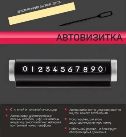 Автовизитка укомплектована набором цифр, из которых владелец самостоятельно набирает контактный номер телефона.