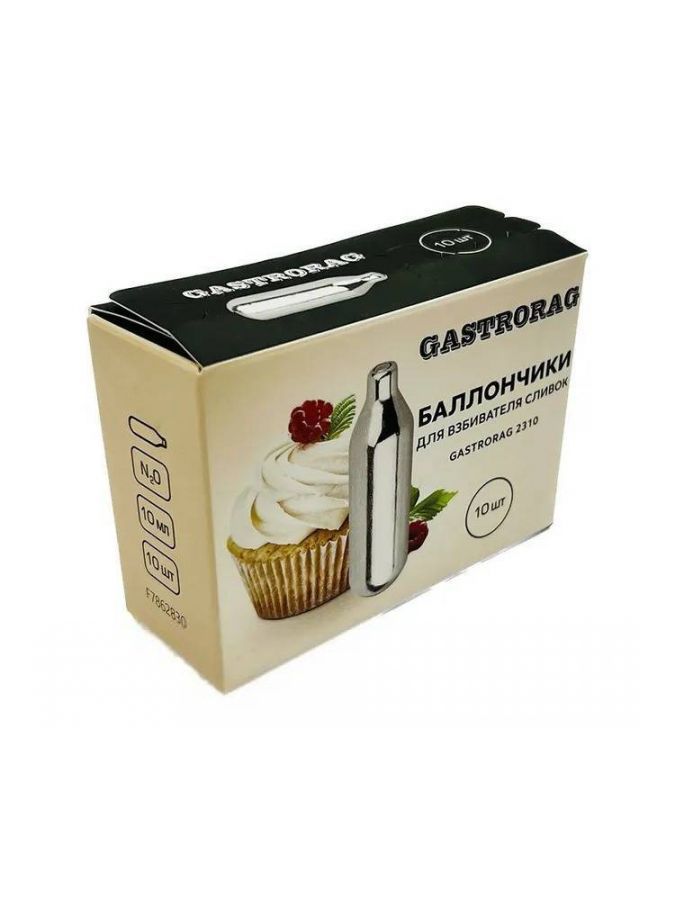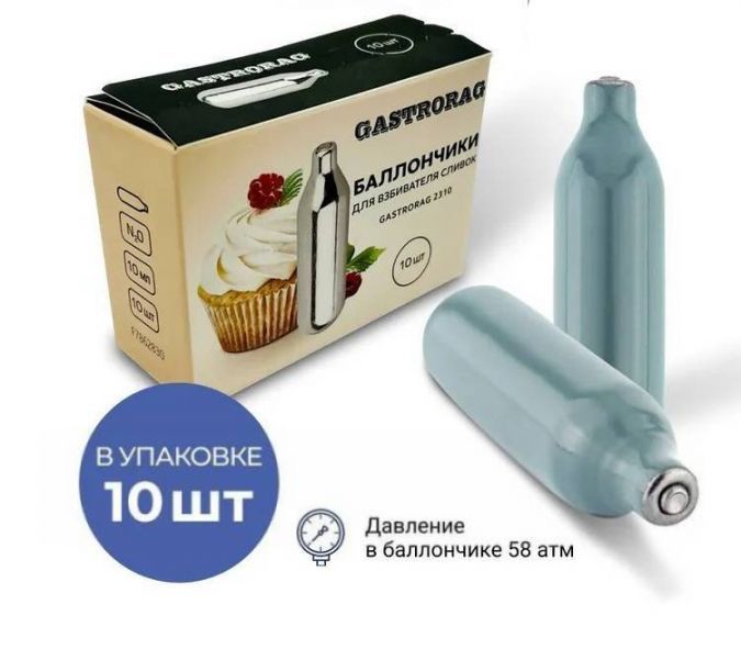 аллончики для взбивания сливок GASTRORAG 2310 представляют собой стандартные одноразовые баллончики с N2O (закисью азота) для взбивания сливок и других жидких ингредиентов при приготовлении десертов, муссов, суфле, соусов и других блюд. Газовые баллончики – востребованный товар для ресторанов, кафе, баров, кондитерских производств. Материал баллона – углеродистая сталь, вес – 31 г, диаметр 18 мм, длина 65 мм, диаметр горлышка 8 мм. Горлышко герметично закупорено. Каждый баллончик содержит 8 г чистого оксида азота - инертного газа, который абсолютно безвреден для человека и создает внутри колбы кремера среду, неблагоприятную для развития бактерий. Благодаря этому готовый продукт можно хранить в холодильнике до 10 дней. Одного баллончика достаточно для получения 0,5 литра взбитых сливок. Давление N2O в баллоне составляет около 58 атмосфер. Чем ниже температура сливок, тем более стабильным будет готовый продукт. Газовые баллончики поставляются по 10 шт. в картонной коробке и подходят ко всем современным сифонам кремерам.