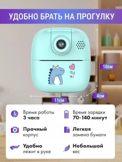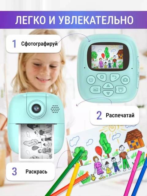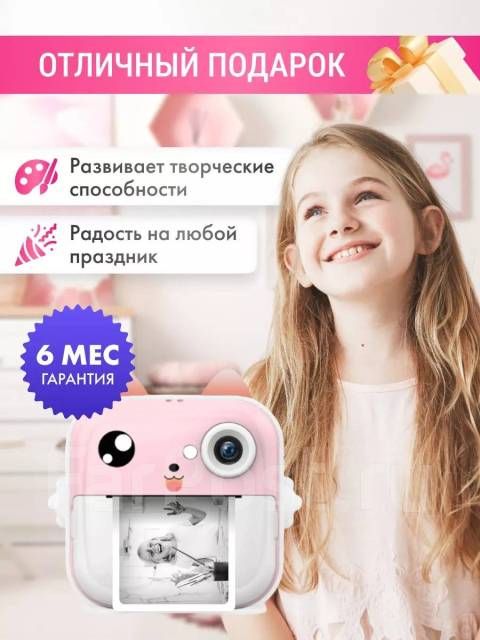 Детский фотоаппарат моментальной печати фото с максимальным комплектом! Вам не нужно будет думать где купить рулоны бумаги, фломастеры и карту памяти - все это уже есть в комплекте. Набор из трех видов термобумаги (цветная - 3 рулона, белая - 6 рулонов и самоклеющаяся 5 рулонов), позволит напечатать более 1200 фотографий. Вспомните, как в детстве всем нравилось печатать фото с обычнойю мыльницы, теперь это радость доступна каждому! Цифровая мини камера с мгновенной печатью - это отличный подарок для девочки или мальчика на День Рождения, Новый год и любой другой праздник! Развивающая электроника и гаджеты это всегда восторг и радость для ребенка. Покупать для детей и подростков настоящий пленочный фотоаппарат полароид ( polaroid ) очень дорого, а наш маленький игрушечный фотик станет прекрасной альтернативой и удивит даже взрослого человека. Он надолго увлечет вашего ребенка и поможет развить его творчество и воображение. Наша мини фотокамера имеет режим съемки видео в высоком качестве, встроенные фоторамки и игры. Вместо пленки используются термобумага, которую можно раскрасить фломастерами. Меню фотоаппарата и инструкция полностью на русском языке. Управление и замена бумаги очень простое. Не упустите возможность стать владельцем этого уникального устройства!