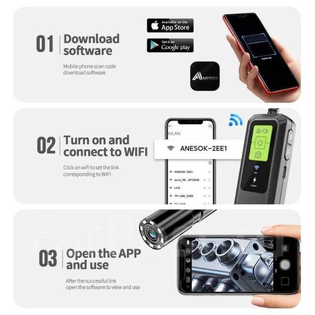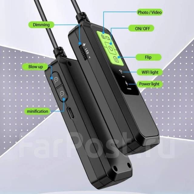 Портативный Wi-Fi видеоэндоскоп имеет камеру высокой четкости и обеспечивает качественную съемку с заявленным разрешением 1920*1080. Прибор позволяет вывести картинку исследуемой области на экран любого смартфона или планшета с ОС iOS/Android. Передача изображения с камеры на смартфон происходит через модуль Wi-Fi со встроенным аккумулятором, обеспечивающим 2,5 часа непрерывной съемки.