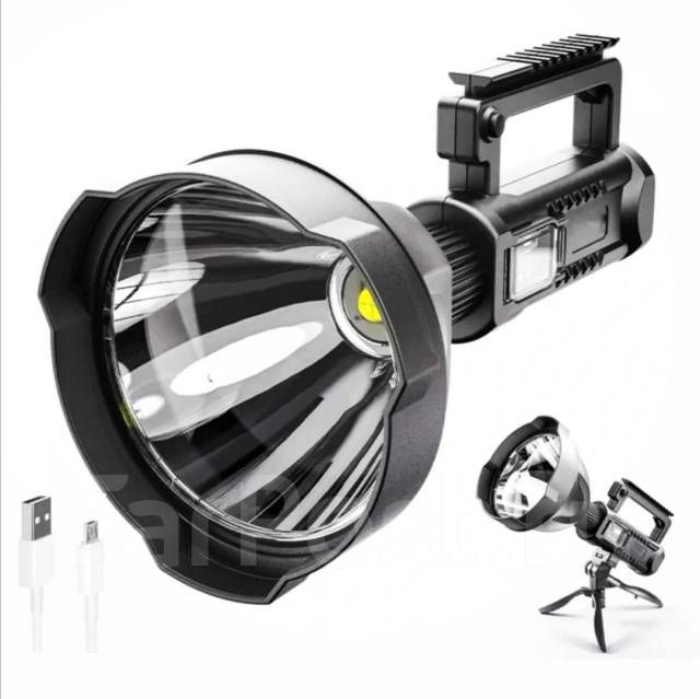 Мощный фонарь, дальность освещения 1500 метров. Время работы до 10 часов. Зарядка от USB, так от фонаря можно заряжать другие устройства. Четыре режима работы: 1. Полная мощность с максимальным освещением; 2. Направленный луч; 3. Малая мощность для помещений; 4. Стробоскоп. Фонарь можно установить на трипод ( входит в комплект) либо на любой штатив со стандартной резьбой.