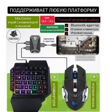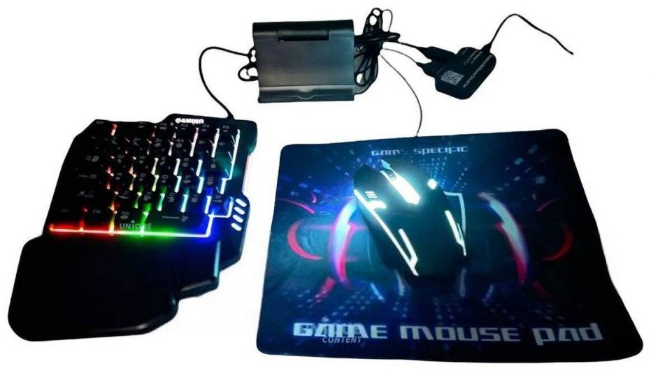 В комплект входят: игровая клавиатура для одной руки с подсветкой и 35 клавишами; игровая мышь с подсветкой и 3 кнопками, Bluetooth-конвектор; держатель для телефона; игровой коврик для мыши. С помощью данных игровых аксессуаров вы можете полноценно погрузиться в мир игр разной сложности, быстрота реакции, четкость в движениях, комфорт в игре вам обеспечены.