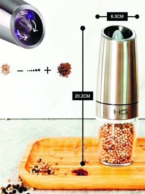 электрическая мельница - это современный девайс для кухни и дома, который облегчит вам жизнь! Главное преимущество измельчителя для специй - легко использовать одной рукой. Очень удобно во время готовки, можете одновременно перемешивать еду и измельчать специи. Достаточно перевернуть гравитационную мельницу вверх дном и она автоматически начнет помол! За счет мощного японского мотора Mikatsu, электромельница работает в 3 раза быстрее механической. Измельчитель имеет вместительный и прозрачный отсек для специй, его легко мыть, специии не будут впитывать влагу и запахи, можете видеть наполненность отсека. Из-за особенностей мельницы, измельченные специи всегда остаются вверху гаджета и не просыпаются на стол! Перцемолка подходит для самых различный специй, так как имеет регулятор помола: крупный, средний и мелкий! Электрическая солонка оснащена Led-подсветкой, которая позволяет лучше видеть количество перемолотых специй! Корпус мельнички из нержавеющей стали практичен и долговечен.