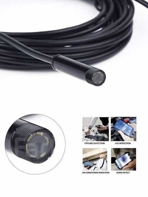 Камера. Гибкий эндоскоп. 6 LED лампочек. Диаметр камеры 7 мм. Длина 5 метров. Разрешение видеозаписи 1200х620 пикселей. Угол обзора камеры 60 градусов. Стандарт водонепроницаемости IP67. Поможет рассмотреть любую мелочь в труднодоступных местах. С фокусировкой и зумом от 3-х до 8-ми сантиметров. Делает моментальные снимки на камеру 0,3 Мп с телефона и 1,3 Мп с ноутбука. Записывает видео с разрешением 1240х680. Частотой кадра в секунду - 30 fps. Обладает подсветкой с шестью диодными лампочками белого холодного света. Полностью пылезащищенная. Выдерживает погружение в воду до 1 минуты на глубину до 1 метра. Работает от micro-USB и USB. Для подключения необходимо мобильное устройство с поддержкой функции USB OTG. Для корректной работы необходимо скачать мобильное приложение USB camera в магазине Google Play.Камера/камера эндоскоп/эндоскоп для андроид.