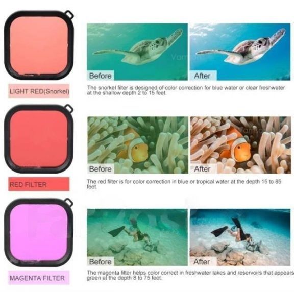 Magenta, fuchsine и фиолетовый фильтр для объектива можно использовать на глубине 5 м-25 м и может исправить отклонение цвета в различном качестве воды