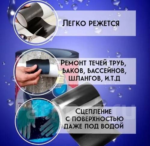 Super Tape — это прочная водоупорная прорезиненная лента, которая останавливает любые протечки образуя водонепроницаемый хомут. Лента стойкая к влаге и не теряет свои свойства под водой. Подходит для быстрого ремонта утечек крыши, водосточных желобов, лодок, наружного и кемпингового оборудования, ПВХ и сантехнических труб, бассейнов, воздуховодов, шлангов и т. д. Ей не страшен снег, ливень, град, дождь и прочие катаклизмы, морозы до -45 и высокие температуры до +85 C. Лента супер фикс создает прочную фиксацию, так что проблема прорыва надувного матраса или канализационной трубы решается за считанные минуты. Хорошо ложится даже на неровную поверхность.