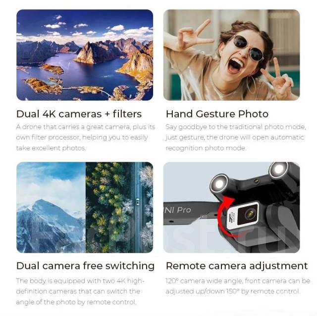 Фотография с помощью жестов, видео, Аварийная остановка, траекторный полет, автоматическая фотосъемка.