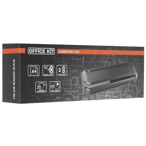 Ламинатор Office Kit L2311 черного цвета имеет довольно компактный корпус и отличается простотой в эксплуатации. Поэтому такое устройство вполне подходит для домашнего использования. Два вала, установленные в ламинаторе разогреваются до нужной температуры за 3-5 минут. А скорость ламинирования составит 220 мм/мин. Толщина используемой в ламинаторе пленки может составлять 70-150 мкм. Максимальный размер ламинируемой документации - А4.