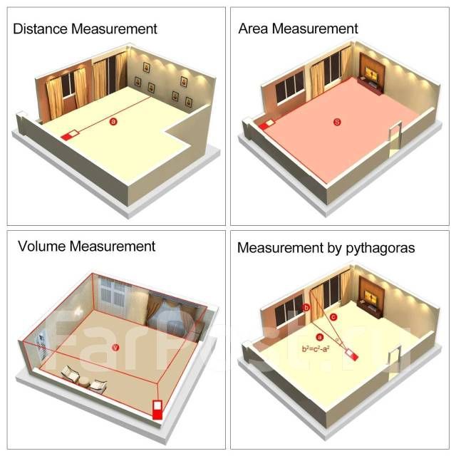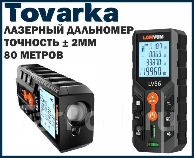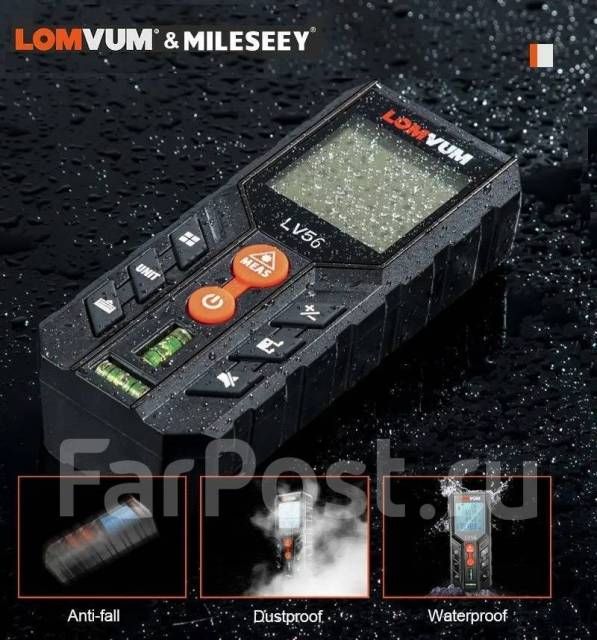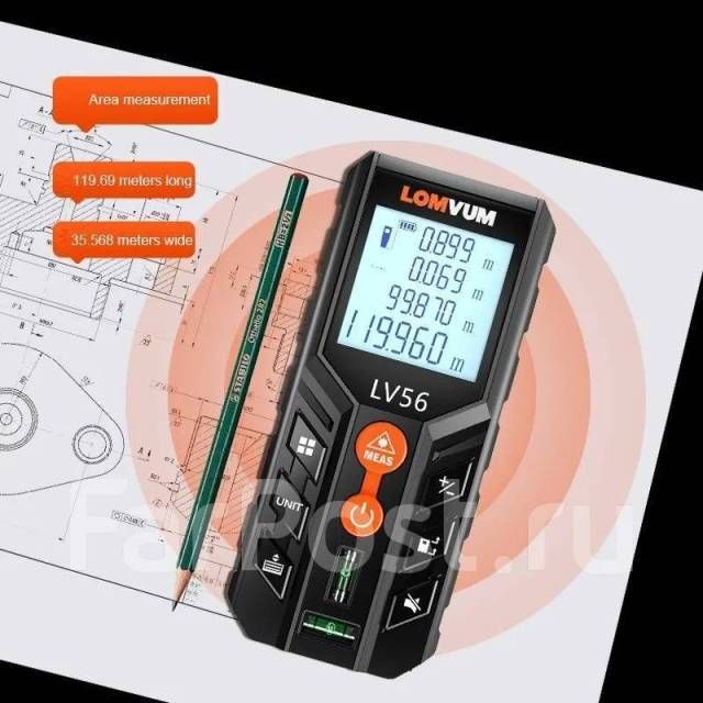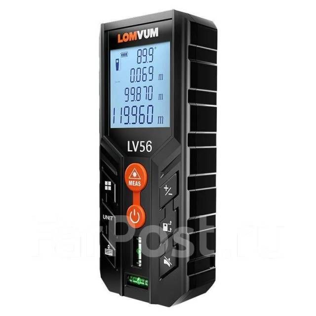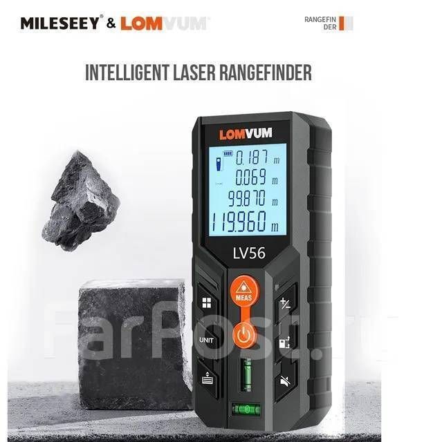 LOMVUM & MILESEEY LV 56 лазерный дальномер 80 метров. Прочный пластиковый корпус с ярким дисплеем с подсветкой, удобные кнопки, яркий лазерный указатель, все это гармонично сочетает в себе лазерный дальномер, позволяя с комфортом работать в любых условия! -Измерение длины отрезка. Измерять можно как от задней плоскости дальномера, так и от передней. -Измерение площади по двум точкам. Очень легко получить площадь стены, пола или потолка. -Измерение объема по трём точкам.