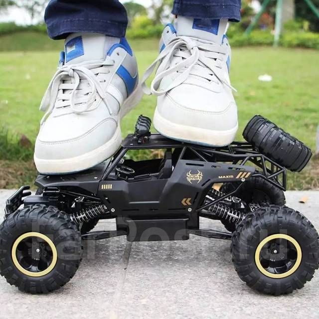 Машинка на пульте радиоуправления, с большими резиновыми колёсами. Независимая подвеска, хорошие пружины, высокий клиренс. Машинка довольно резвая и мощная, легоко карабкаеться в подъёмы и заезжает на ступеньки. Отлично едет по бездорожью ровняет под собой траву. Лично проверил все её ходовые качества, фото оригинальные. Частота пульта 2.4 герц, пульт настраивается только на эту игрушку, и другие помехи не будут мешать. При движении горят фары.