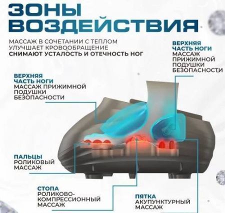 Электрический массажер для ног основан на древней технике массажа шиацу. Роликово-компрессионный массажер для ног c ИК-прогревом разминает стопы роликами и воздушными подушками с учетом расположения акупунктурных точек, заменяя ручной массаж в салоне. Электромассажер для ног имеет 2 режима.