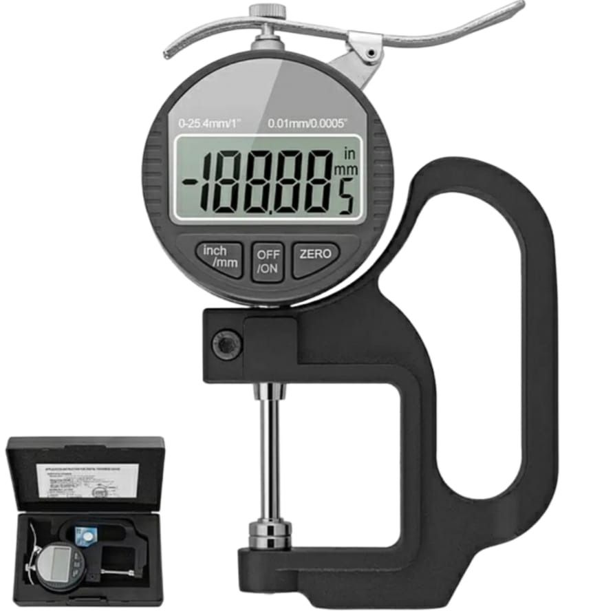 Калиброванный толщиномер с диапазоном измерений от 0 до 0,5 дюйма (от 0 до 25,4 мм), разрешением до 0,0005 дюйма и точностью + или - 0,01 мм.
