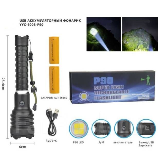 Читать все статьиМощный фонарь ручной металлический тактический +ЗУМ YYC-6008-P90