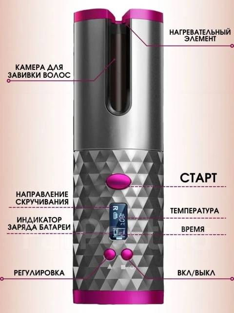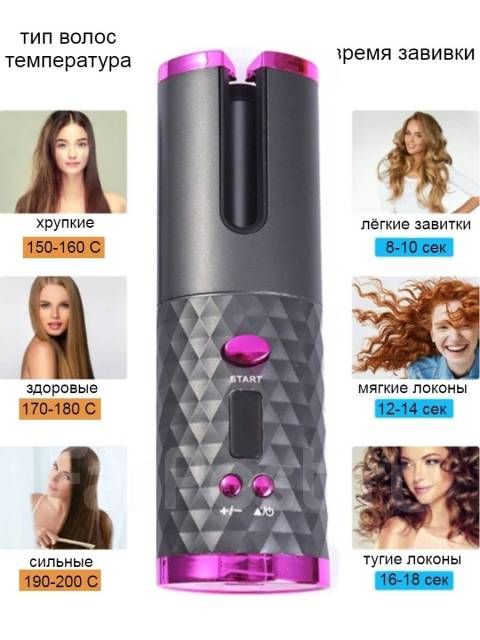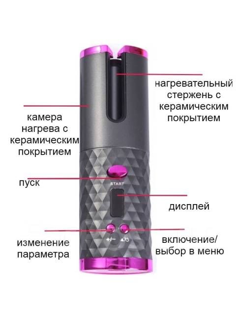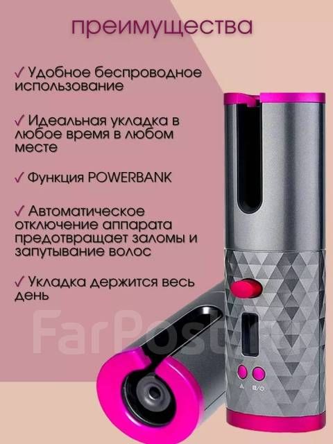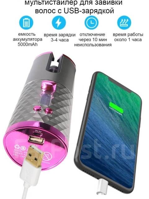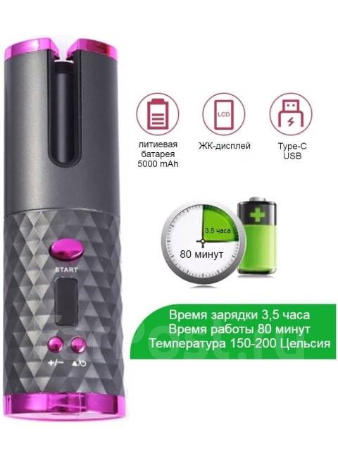 Беспроводной мультистайлер для завиви волос До 1 часа работы в непрерывном режиме при максимальной температуре 200 градусов. Вы можете взять плойку с собой в офис или в поездку. Мультистайлер имеет USB-разъем и функцию зарядки внешних устройств. Ёмкость аккумулятора 5000mAh. Камера для автоматической укладки имеет керамическое покрытие, которое равномерно распределяет тепло и запечатывает влагу внутри чешуек волос, сохраняя их здоровье и блеск. Выбор температуры от 150 до 200 градусов и продолжительности укладки от 8 до 18 секунд. Плойка позволяет выбрать направление завивки: налево или направо. Все настройки отображаются на ЖК-дисплее. Диаметр завивочного нагревательного элемента 19 мм. Идеальное устройство для того чтобы сделать укладку вне дома.Нужно выбрать длительность укладки и температру, поместить волосы в керамический отсек и нажать кнопку старт. После этого волосы сами накручиваются и равномерно нагреваются со всех сторон. Начнётся отсчет обратного звукового таймера