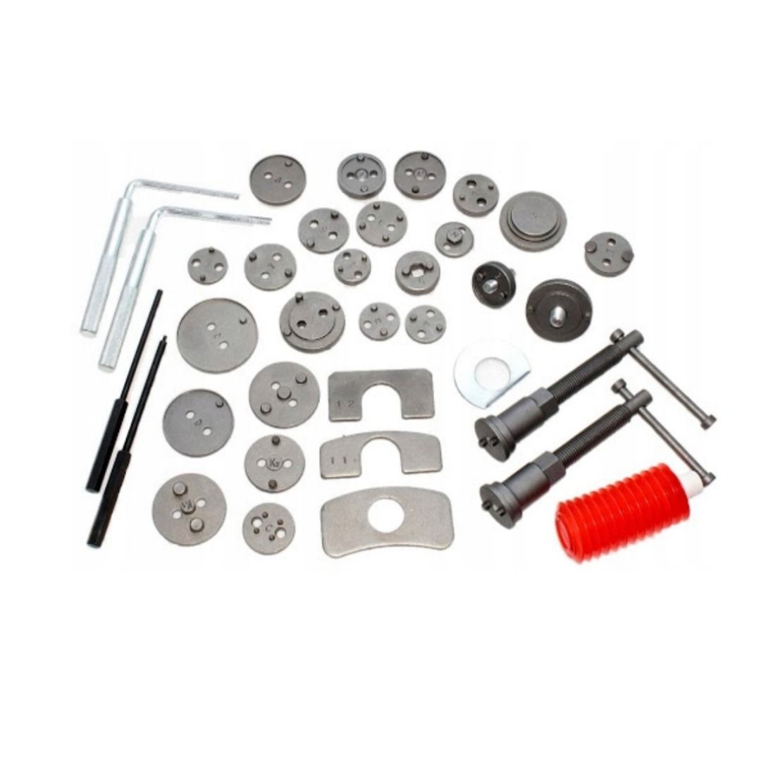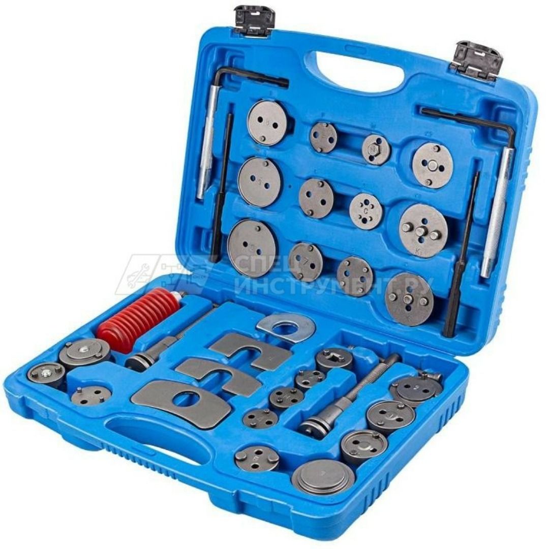 Профессиональный набор для обслуживания, ремонта и замены тормозных колодок и цилиндров на автомобилях с дисковыми тормозами. Подходит для большинства современных моделей с системами ABS, а также для автомобилей с левым и правым направлением резьбы поршней.