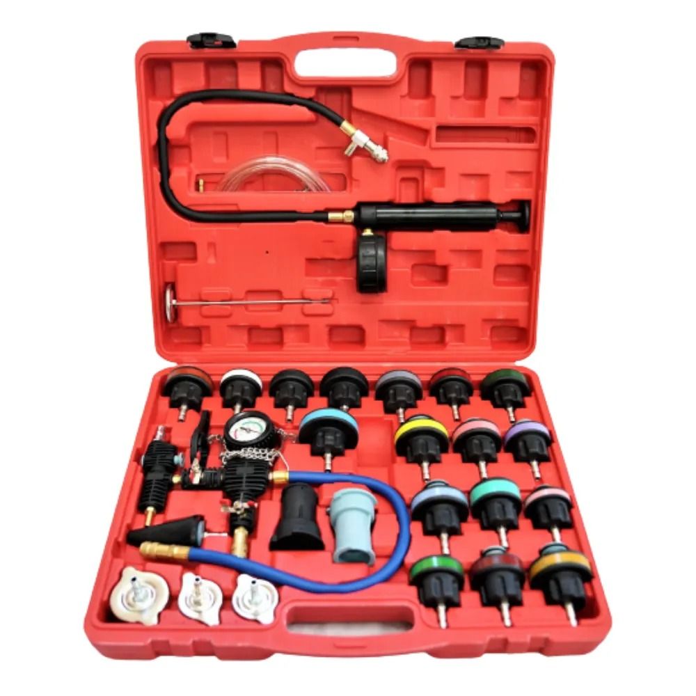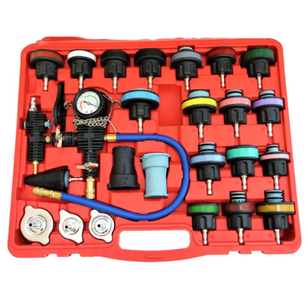 Универсальный набор для проверки герметичности радиатора, состоящий из 28 предметов, включает в себя 17 колпачков для проверки герметичности радиатора с цветовой маркировкой и универсальный резиновый конусный адаптер практически для всех отверстий радиатора в большинстве автомобилей в стране и за рубежом. Еще 3 адаптера для проверки герметичности крышки радиатора и 2 разъема для обнаружения герметичности крышки радиатора. Все они хорошо расположены в корпусе, имеют полные технические характеристики и просты в сборке. Широко совместимы с GM, BMW, VW, GMC, Porsche, Chevy, Dodge, JEEP, Chrysler и многими другими моделями легковых автомобилей, грузовиков и авиалайнеров.