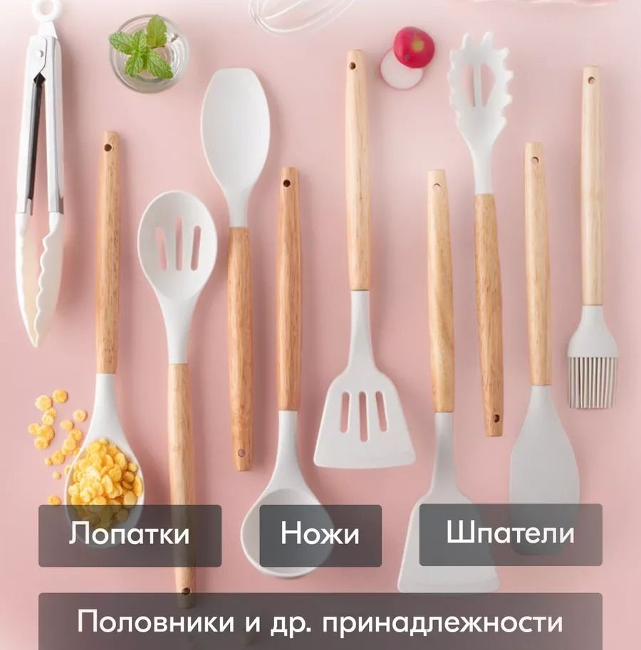 щипцы, лопатку с отверстиями для слива масла, половник, ложку для выпечки, кисточку для масла, дуршлаг для спагетти и шумовку. Каждый имеет комфортную длину от 25 до 34 см. Как приложение к этому, комплект включает удобную подставку из пластика! Деревянные элементы изготовлены из экологически чистого бамбука, который зарекомендовал себя как один из самых прочных и долговечных материалов для кухонной утвари. Силиконовые части не впитывают цвета и ароматы, не царапают посуду и безопасны при контакте с пищевыми продуктами. Приборы из этого набора кухонных принадлежностей будут сочетаться с любым дизайном, придавая вашему пространству элегантность и стиль. Ваши гости и домочадцы непременно оценят ваш выбор. Металлические детали сделаны из нержавеющей стали, что гарантирует их долгий срок службы и устойчивость к коррозии.