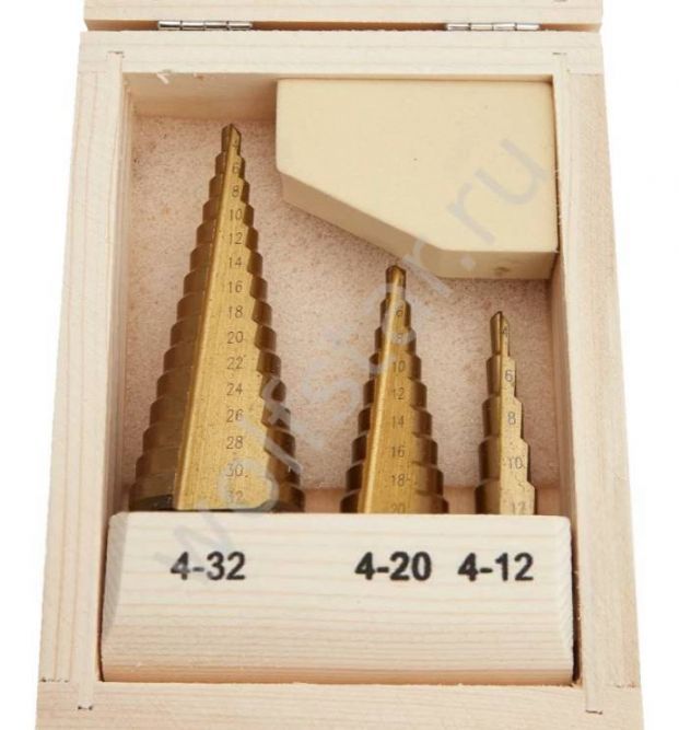 Набор ступенчатых сверл 3 шт, 4-32 мм предназначен для сверления различных типов стали, цветных металлов, меди, латуни и алюминия, нержавеющей стали, пластика и дерева. Позволяет сверлить точные отверстия. Может применяться в кузовных мастерских, автомастерских и т.д. Для профессионального использования.