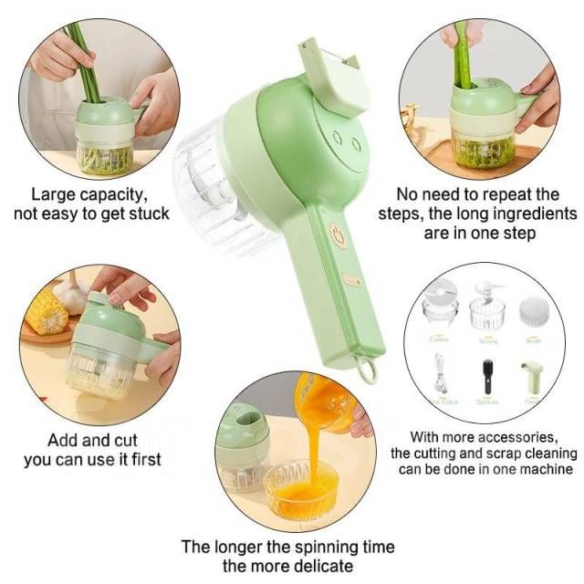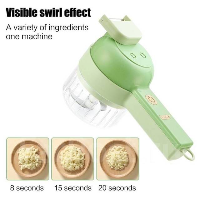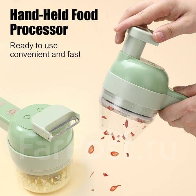 Универсальный многофункциональный беспроводной кухонный измельчитель 4 в 1. Сочетает в себе несколько функций: измельчитель электрический, овощерезка, шинковка для овощей, электрическая моющая щетка для поверхностей. Нажав и удерживая одну кнопку, вы с легкостью измельчите чеснок, лук, перец чили, петрушку, имбирь, арахис, мясо детское и другие ингредиенты в течение 10 секунд. Портативный блендер оснащен мощным двигателем и 2 твердыми и острыми лезвиями насадками, выполненными из высококачественной нержавеющей стали. Также в комплект к измельчителю идут две чаши: открытая с защитой от брызг для нарезки овощей и обычная чаша 200мл электрическая терка для чеснока и овощей, которая позволяет проводить измельчение и смешивание. Измельчитель беспроводной работает от аккумулятора с использованием USB зарядки. Лезвия и чаша для гаджета съемные, что упрощает очистку. Мини миксер кухонный комбайн прекрасно подойдет на подарок для любимой девушки, женщины, маме, жене, дочери, бабушке, на день рождения 8 марта.