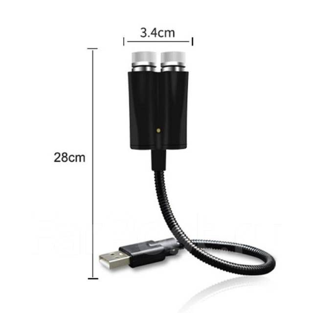 Лазерный проектор является частью украшения интерьера, а также служит для подсветки салона авто. Мощный лазерный луч, посредством динамической дифракции, делится на тысячи точек, создавая при этом удивительный эффект "звездного неба" - над головой пассажиров и водителя раскинуто множество точек света, создающих иллюзию звезд. Питание устройства осуществляется через USB кабель, который можно подключить к повербанку или к бортовой сети автомобиля через соответствующие USB адаптеры.