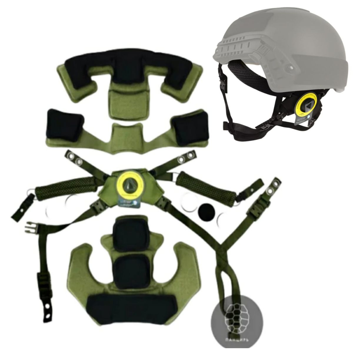 В комплекте мягкие подушки + сама подвесная система + наклейки липучки (для крепления подушек) + болты (для крепления подтулейного устройства к шлему).