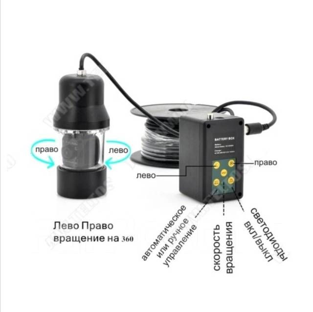 Назначение видео удочки : 1. Обеспечивает минимальный уровень потери наживки . 2. Увеличивает шанс успешной поклевки . 3. Эффект полного погружения в атмосферу рыбалки , эффект присутствия " , а также - контроль над процессом ловли рыбы . 4. Даeт значительное преимущество , перед рыбаками использующими обыкновенные удочки . , 5. Анализирование каждой поклевки с последующей коррекцией навыков Подводная камера для рыбалки Длина кабеля подводной камеры увеличена до 100 метров ! Это позволит заниматься рыбалкой на глубоких водоёмах . Камера имеет светодиодную подсветку . С такой подсветкой не возникнет проблем с наличием естественной освещенностью для изображение на большой глубине или в ночное время суток . Камера имеет уникальную возможность вращения на 360 градусов . С помощью проводного дистанционного управлния возможно вкл / выключать подсветку и задавать вращение самой камеры .