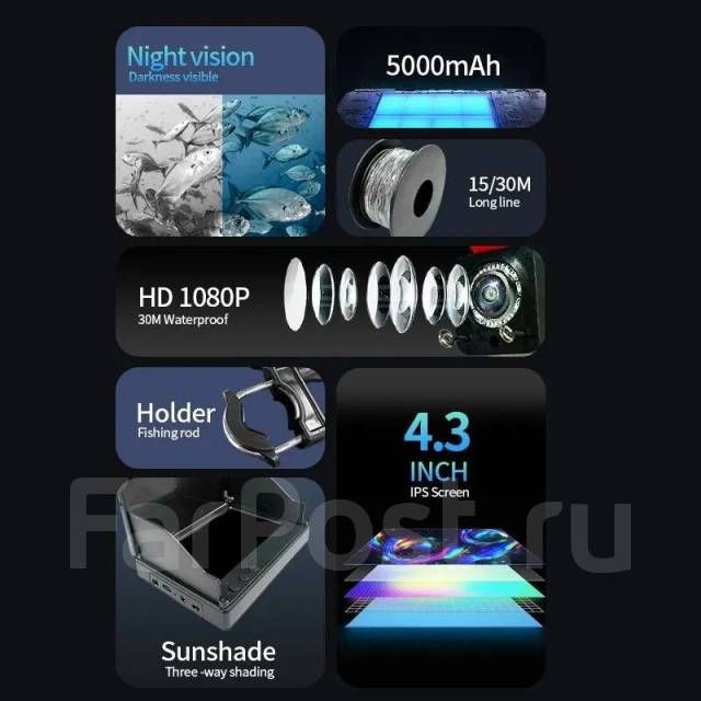 с обновленным 4,3-дюймовым ЖК-экраном (более четким для отображения) может обнаруживать и отображать подводный контур, глубину воды, температуру воды и размер рыбы (Большой/средний/маленький) и глубина рыбы.