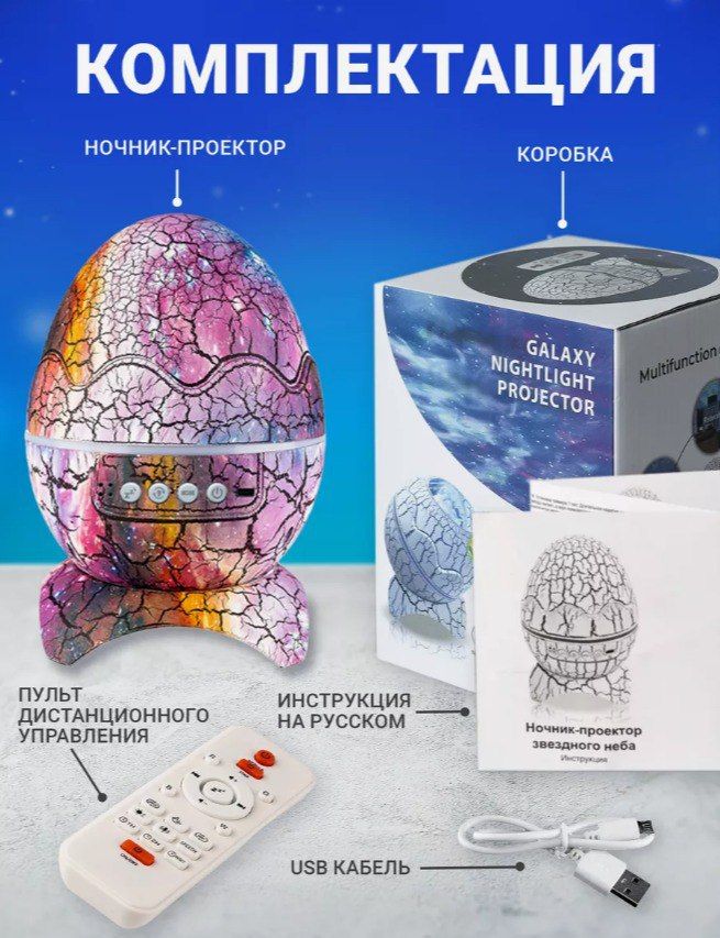 В подарочный набор входит. Все функции можно включать и выключать по отдельности, комбинируя их для создания уникальной атмосферы в комнате. Яйцо Динозавра - это не только красивый предмет интерьера, но и функциональный гаджет, который создаст неповторимую обстановку в вашей комнате. Светильник-проектор дарит удивительные эмоции и радость всей семье. Не забываемый подарок на новый год (особенно в год Дракона), день рождения сына, 1 сентября, 8 марта, 23 февраля. Такой маленький планетарий будет отличным презентом для ребенка, наш светильник-проектор звездного неба будет идеальным выбором. Удивите своих друзей, любимую девушку светящейся феерией праздничного вечера. Воспользуйтесь качеством и безопасностью нашего товара, который сопровождается инструкцией на русском языке.
