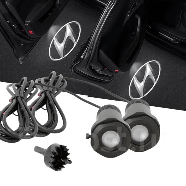 Цена указана за комплект, куда входят 2 проекторы с логотипом Hyundai и сверло для установки.