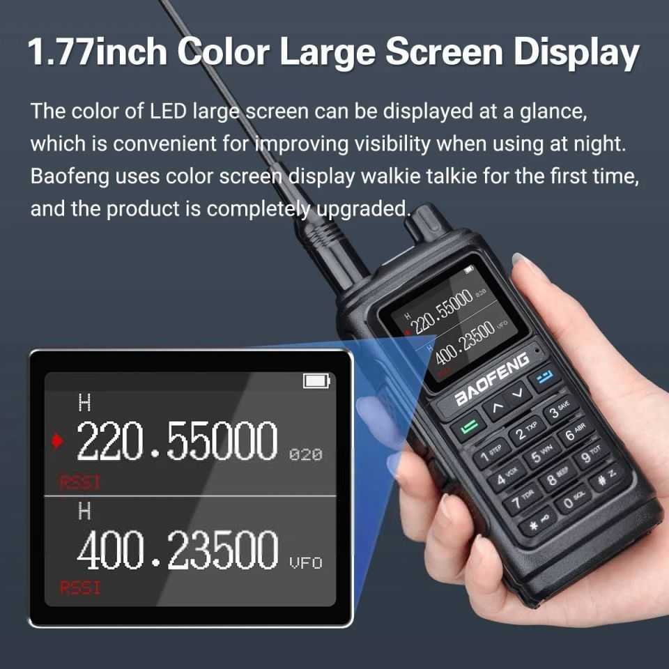 Оснащенная большим цветным двойным дисплеем размером 1,77", эта радиостанция позволяет вам легко контролировать и настраивать все необходимые параметры. Яркий встроенный фонарик даст вам возможность использовать радиостанцию даже в условиях недостаточной освещенности.