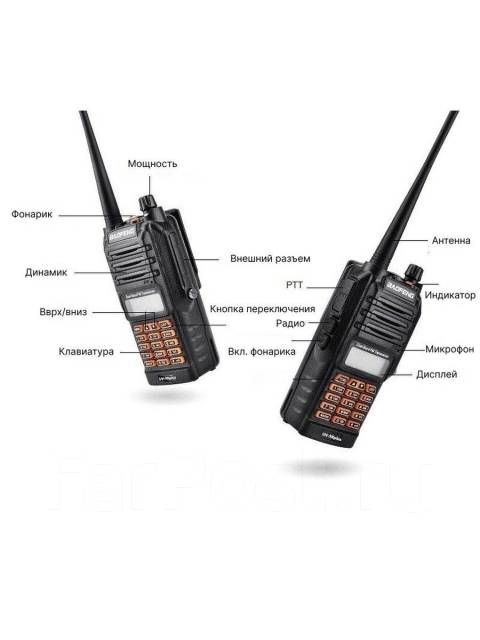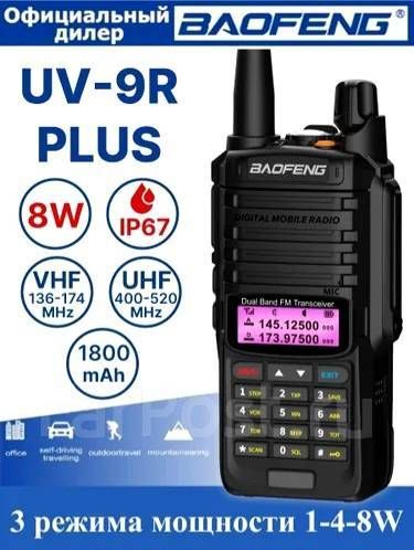 Радиостанция Baofeng UV-9R Plus (8W) IP67 - портативная рация для охоты, рыбалки, туризма. В комплекте: антенна, гарнитура, зарядка, ремешок, клипса. Это профессиональное устройство связи работает в двух диапазонах 136-174 МГц, 400-520 МГц. Может принимать сигнал одновременно на двух частотах. Рацию можно перепрошить, чтобы общаться на своих частотах, используя ее вместо телефона. Для удобства можно подключить тангенту. Мощность 8 Вт позволяет вести переговоры на 10 км. С помощью мощной дополнительной антены можно увеличить дальность до 40%. Аккумулятор 1800 мАч позволяет работать в автономном режиме 1-2 дня. Также можно взять переносное зарядное устройство, чтобы заряжать аккумуляторную батарею в походных условиях. Благодаря водозащите IP67 радиостанция Баофенг подходит для лесных и речных походов. Вес всего 250 г. Удобно помещается в сумку или подсумок. Рацию можно недорого доукомплектовать набором аксессуаров: наушниками, гарнитурой, микрофоном, держателем или другим креплением. ПОЛНАЯ КОМПЛЕКТАЦИЯ: Радиостанция Антенна Аккумулятор UV-9RPlus, Li-ion 2500 мАч, Зарядное устройство "стакан"Адаптер питания для з/у от сети 220 ВКрепление на пояс - клипсаШнурок на запястьеГарнитураИнструкция
