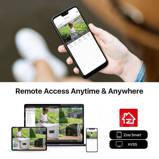 Удаленный доступ: (Также необходимо подключить систему к Интернету) Легко получать прямую трансляцию или воспроизводить видео через приложение ZOSI на устройствах iOS и Android, через клиентское программное обеспечение ZOSI на Windows или Mac, или через основные браузеры.