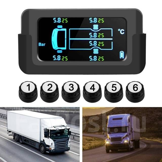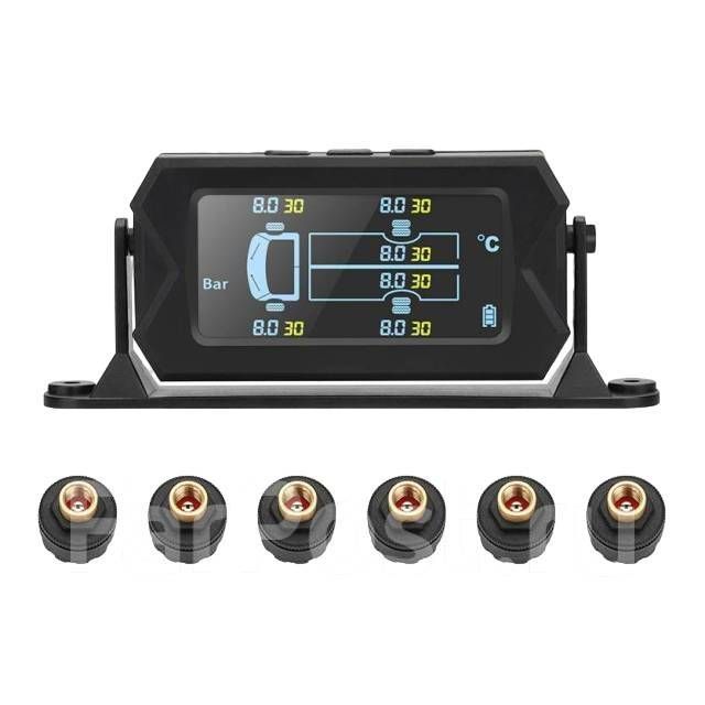 Беспроводная система из приемника с ЖК-дисплеем и 6 передатчиков для отслеживания давления и температуры в шинах в реальном времени.