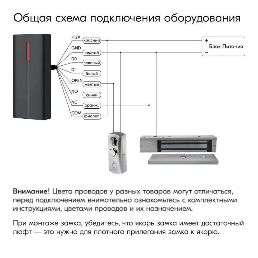 Комплектация Электромагнитный замок с уголком, 180кг; Кнопка выхода, Блок питания; 10 бесконтактных ключей доступа; Бесконтактный считыватель карт