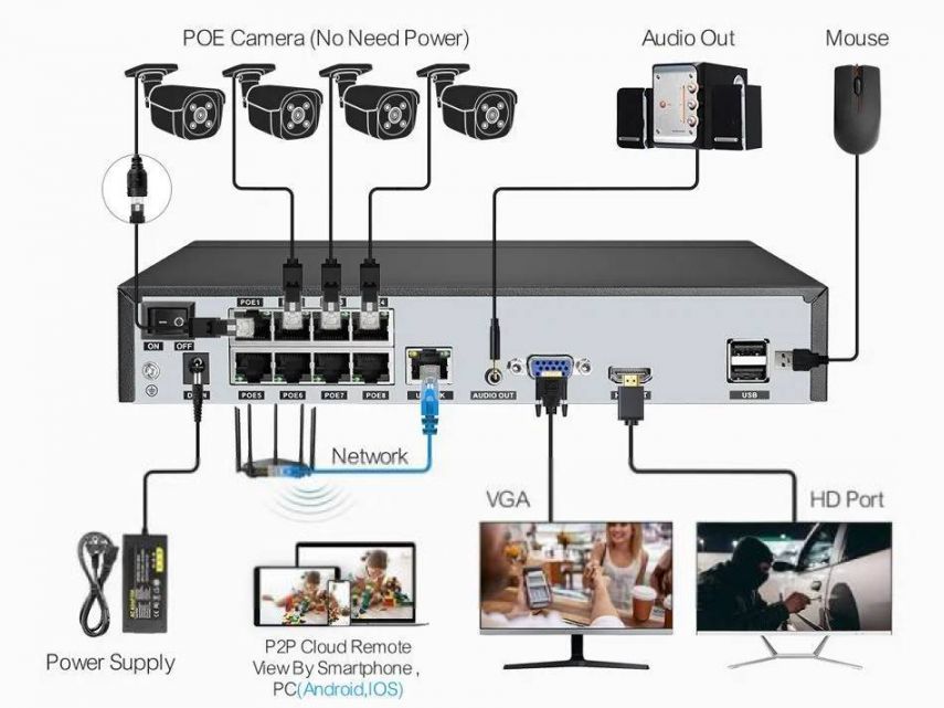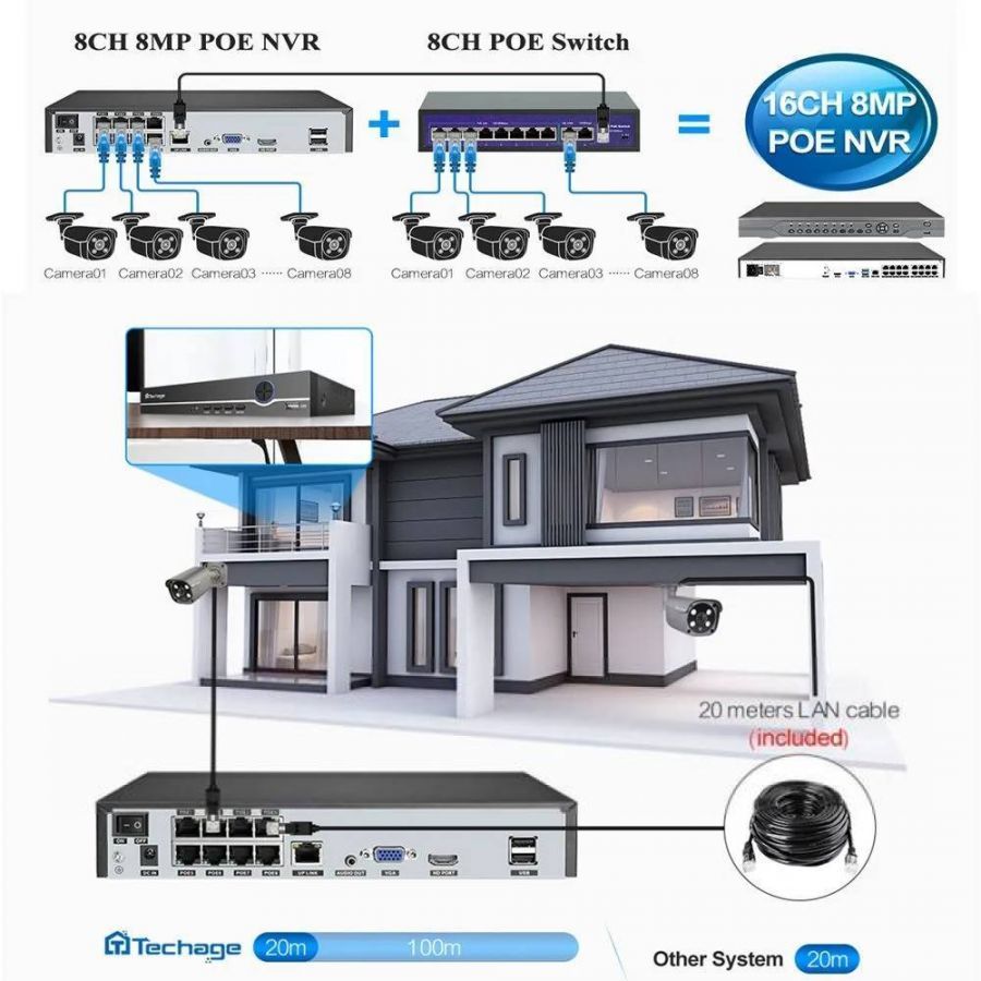 Камеры POE с разрешением 5 мегапикселей (2592 x 1944) обеспечивают кристально четкое изображение, позволяя вам различать мельчайшие детали. Сетевой видеорегистратор (NVR) поддерживает 8-канальный дизайн, что дает возможность подключения до 8 камер. При использовании дополнительного 8-канального POE-переключателя систему можно расширить до 16 камер, обеспечивая полный охват охраняемой территории.