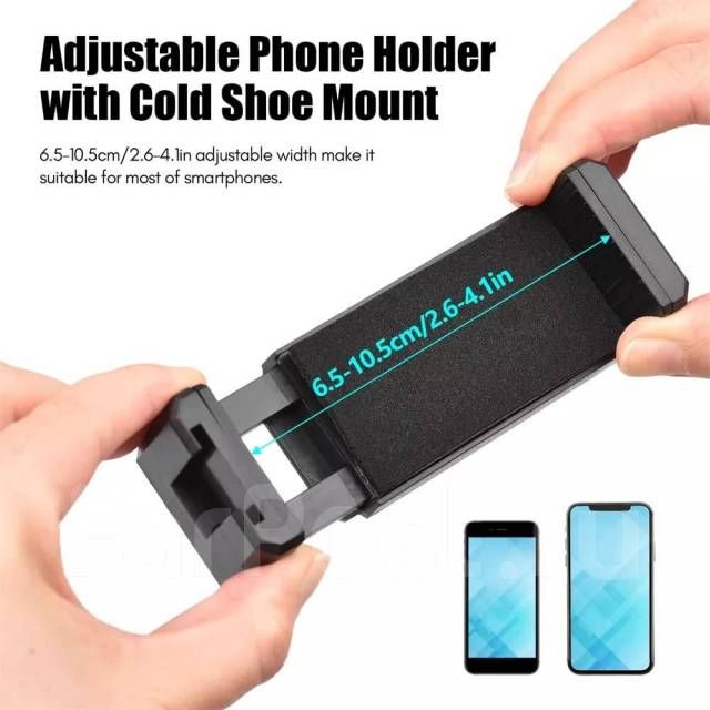 Регулируемый держатель телефона: регулируемая ширина 6,5–10,5 см/2,6–4,1 дюйма делает его подходящим для большинства смартфонов, а верхний холодный башмак позволяет легко установить микрофон или светодиодную лампу.