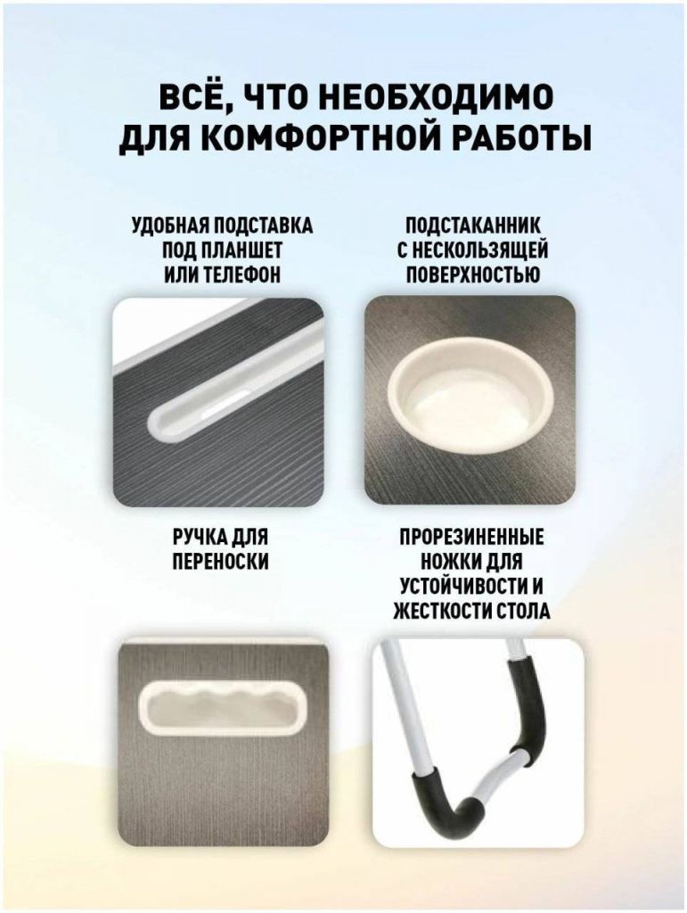 Ножки компьютерного столика изготовлены из алюминиевого сплава, что обеспечивает легкость и прочность конструкции. За счет антискользящих накладок на ножках, стол надежно фиксируется на любой поверхности-пол, стол, кресло или кровать.