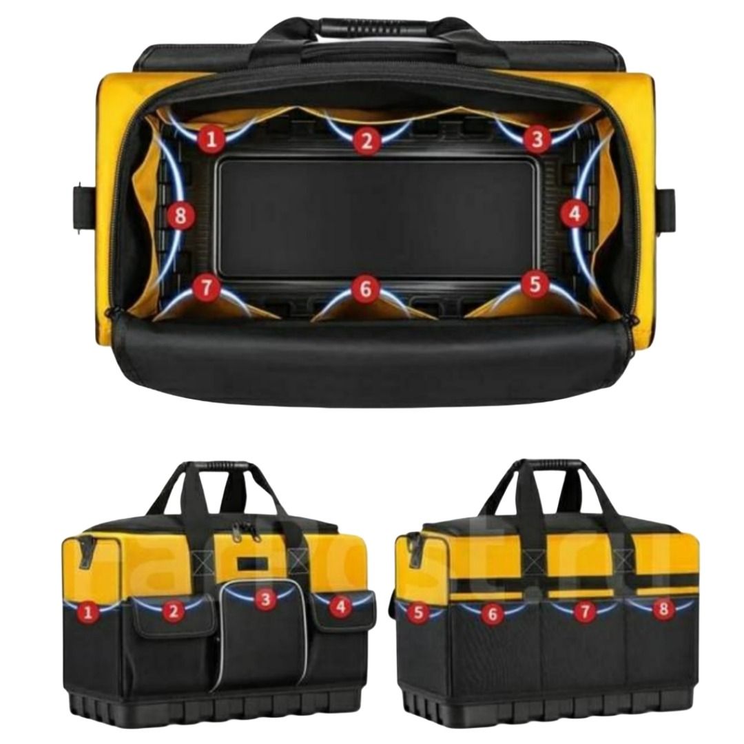 Сумка для хранения и переноски инструмента она имеет пластиковое дно и предназначена для хранения различных строительных ручных и электроинструментов, таких как шуруповерт, дрель, лобзик и болгарка. Профессиональный органайзер поможет аккуратно расположить молоток, газовый ключ, пилу и другие предметы. Сумка на плечо обеспечит удобство при переноске для электромонтажника, строителя, монтажника или автослесаря. Вы сможете взять с собой любой набор аксессуаров, так как он имеет металлический каркас на молнии и пластиковое дно. Ваша работа станет более комфортной благодаря продуманному дизайну чехла для хранения вещей. Ткань Оксфорд с водоотталкивающим слоем защитит содержимое от влаги.