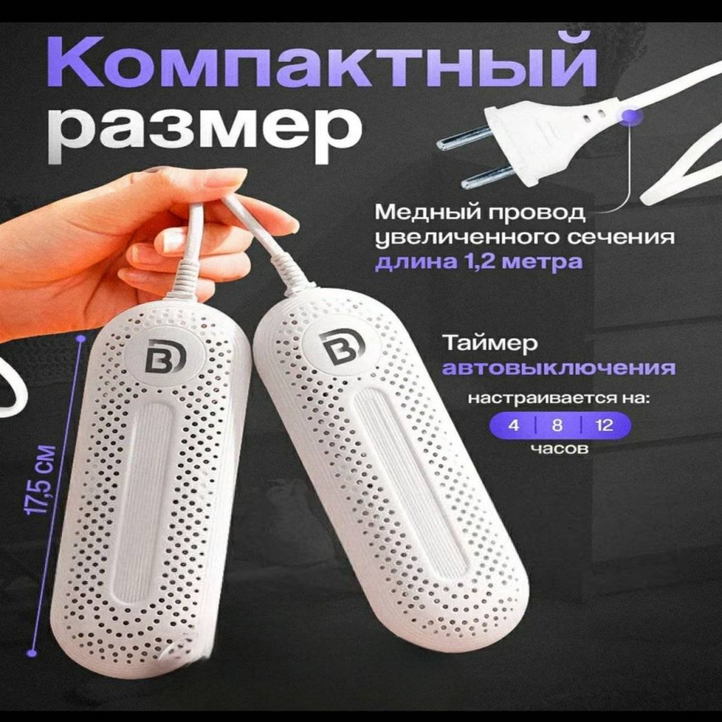 Сушилка для обуви DORBERG с таймером представляет собой инновационное решение для быстрого и эффективного сушки обуви. Этот устройство создано для устранения влаги и неприятных запахов, обеспечивая при этом гигиеничность и долговечность вашей обуви.Сушилка не только сушит обувь, но и дезинфицирует её, убивая до 99,9% бактерий и грибков.