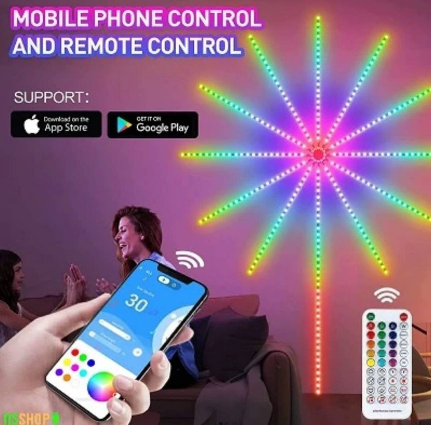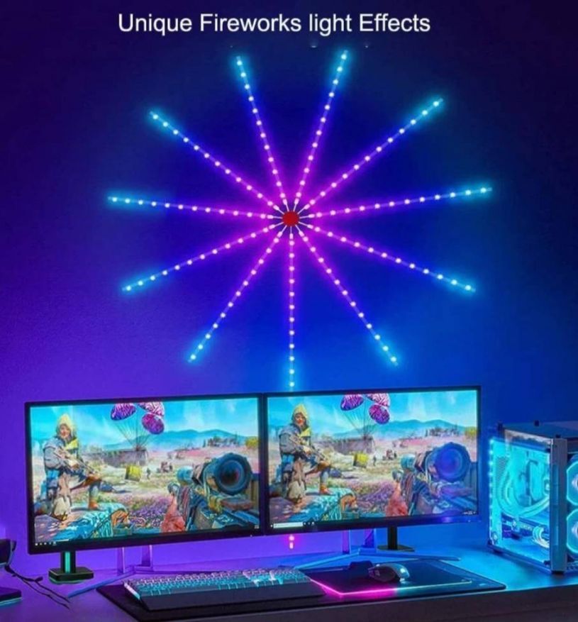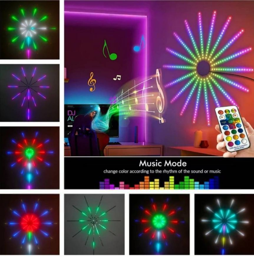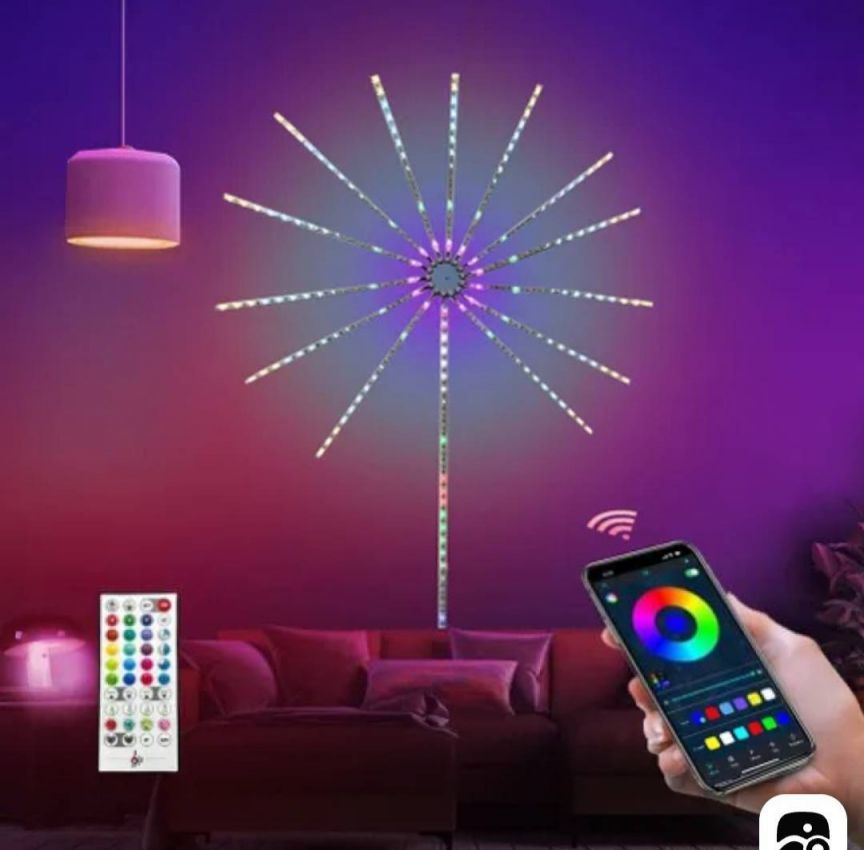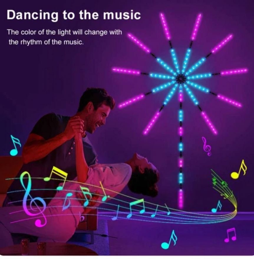 Светодиодные фонари-фейерверки с синхронизацией света и музыки RGB и управлением через Bluetooth — это стильное и яркое решение для создания атмосферы на любой праздник или мероприятие. Эти светодиодные ленты меняют цвета и работают в ритме музыки, что делает их идеальными для декора вашей гостиной, спальни, веранды или для особых случаев, таких как Рождество, Хэллоуин, вечеринки и юбилеи. Это отличный подарок для семьи и друзей.