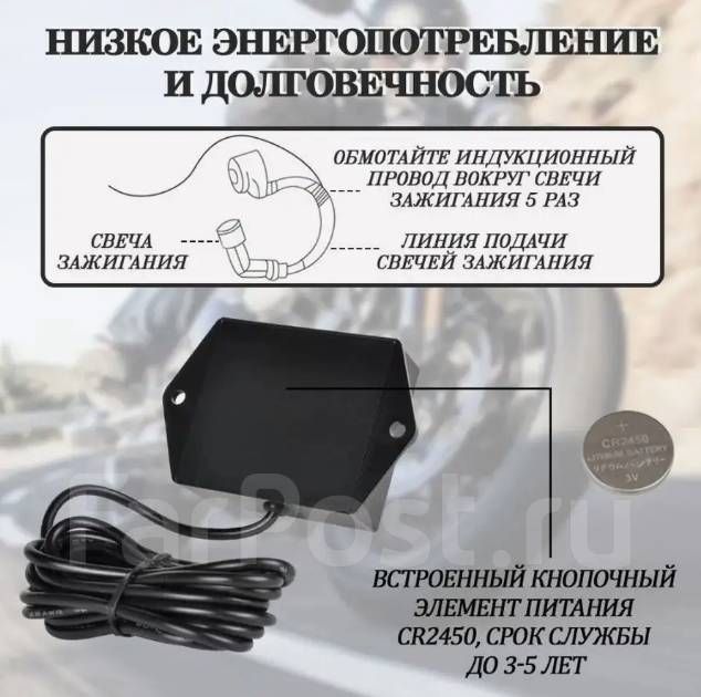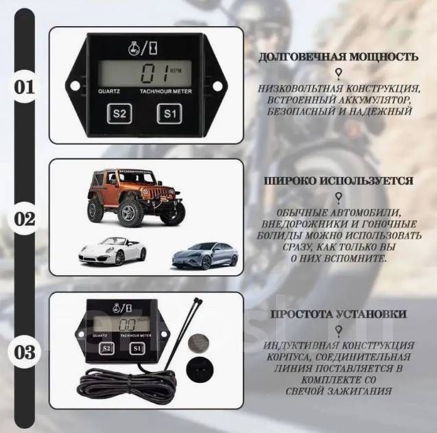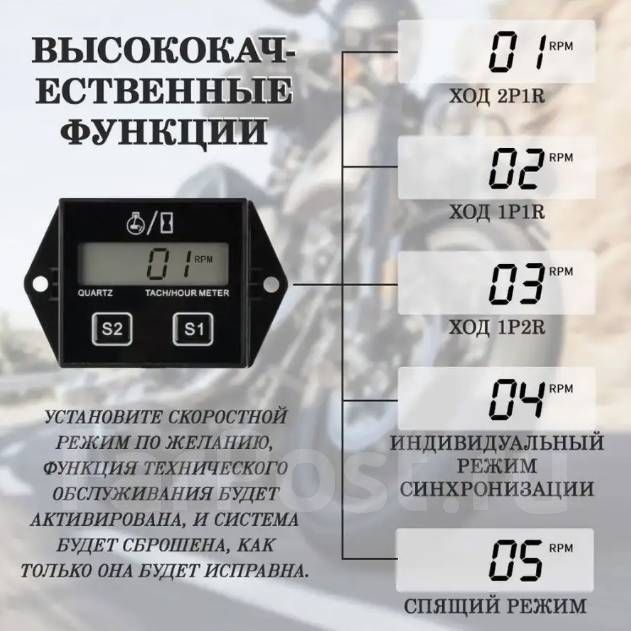 Тахометр - измерительный прибор, предназначенный для измерения частоты вращения коленвала двигателя.Легкий монтаж. Для установки прибора не требуется никаких спец.инструментов, доработок конструкции техники, пайки и т.д.Подходит как для двухтактных,так и для четырехтактных двигателей (тип зажигания перестраивается)Данная модель цифрового тахометра дополнительно оборудована счетчиком моточасов.Также есть функция планирования технического обслуживания (отсчет сервисного интервала).Незаменимая вещь для всех водомоторников. Очень актуальное устройство как для обкатки подвесных лодочных моторов ПЛМ(отслеживание перекрутов и отсчет часов наработки до первого ТО), так и для дальнейшей грамотной эксплуатации техники.Данный тахометр также подойдет для автомобиля, мопеда, скутера, катера, лодки, мотоцикла, байка, багги, картинга, квадроцикла, снегохода, мотособаки, гибрида ветерок, авто, питбайка, машины, мотоблока, культиватора, бензопилы, газонокосилки, мотобура, тримера и другой техники с бензиновым ДВС. Данное решение позволяет обеспечить полную герметичность корпуса, для установки на водный транспорт (лодки, катера, гидроциклы). Срок службы батареи 2-3 года. . В комплекте инструкция на русском языке.Тахометры и счетчики моточасов - это очень полезные устройства, позволяющие эксплуатировать технику правильно. Прибор предназначен для измерения числа оборотов в минуту времени работы и отсчета времени до очередного сервисного обслуживания любого бензинового двигателя внутреннего сгорания имеющего свечу зажигания. Устанавливается в любом удобном для контроля показаний месте ограниченном длиной входящего комплект кабеля. Крепление прибора, к выбранной для установки поверхности, осуществляется через отверстия в корпусе саморезами, пластиковыми хомутами или при помощи двухстороннего скотча, например - на румпель лодочного мотора, защитный кожух механизма, рукоятку тримера, приборную панель скутера, мотоцикла и т.д. Не требует дополнительного источника напряжения. Конец кабеля, противоположный прибору, обматывается вокруг высоковольтного проводи подходящего к свече зажигания любого из цилиндров двигателя и фиксируется либо пластиковым хомутом, либо изоляционной лентой. При пуске двигателя прибор автоматически переходит в режим тахометра, отображая на экране дисплея количество оборотов в минуту, производимых двигателем, если не задан другой режим работы. При остановке двигателя прибор отображает на экране дисплея количество отработанных часов накопительным методом дискретностью 1/10 часа (6 Мин.). При необходимости счетчик моточасов можно обнулить.