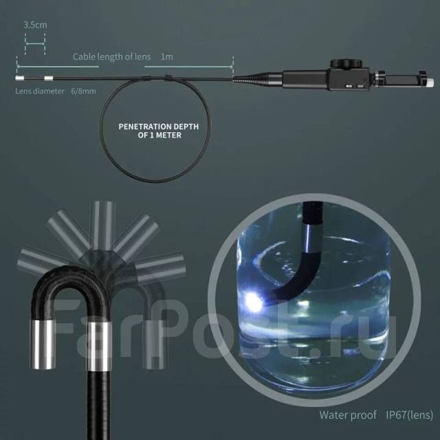 Кабель и камера эндоскопа защищены от влаги по стандарту IP67, и могут работать в воде и горюче-смазочных материалах. Благодаря диаметру камеры 6.2мм можно с легкостью проникнуть в узкие щели и отверстия. А гибкий, однако жесткий кабель, позволит протолкнуть камеру в труднодоступные места, повторив нужную форму зафиксировать ее, выполнить поворот.