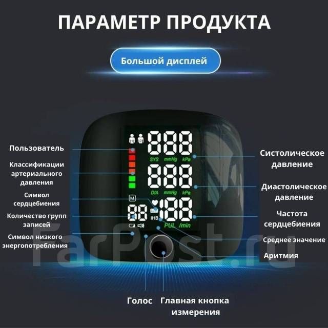 Имеет индикаторы: аритмии, уровня давления по классификации ВОЗ, низкого заряда источника питания.