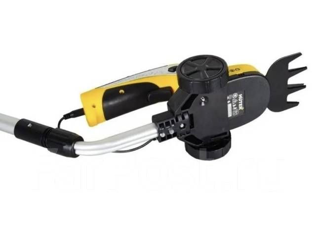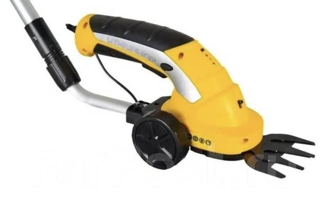 В конструкции данной модели предусмотрена телескопическая штанга и колесики. С удлиненной ручкой удобнее подравнивать газон - не приходится нагибаться. Простая конструкция электротриммера с электродвигателем 220В, делают его использование максимально удобным и упрощает транспортировку. С такой электрокосой справится даже неопытный пользователь. Триммер для травы электрический с частотой ходов 1100 об. мин и с воздушным охлаждением. Электрокосилка-сучкорез имеет литий-ионный аккумулятор и два ножа (для кустов и травы). Каждый из ножей имеет по два лезвия, двигающиеся друг относительно друга. У аппарата оптимальная геометрия лезвия - для быстрой стрижки, а тихая работа позволяет не одевать специальные средства защиты слуха.