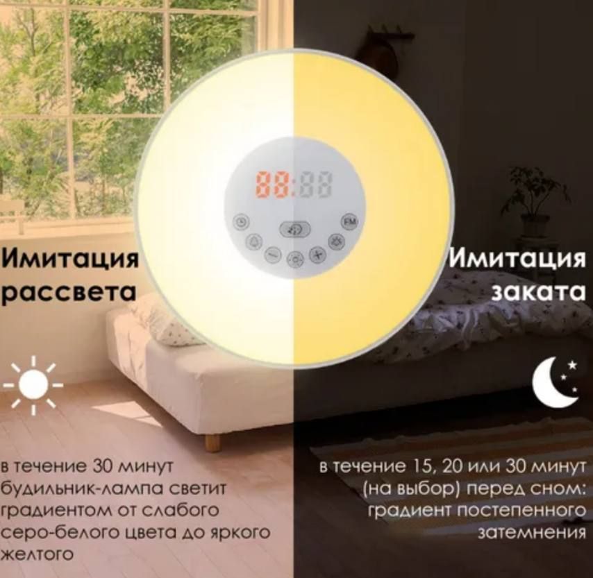 Световой будильник РАССВЕТ СМАРТ имитирует восход солнца и помогает сделать утреннее пробуждение намного легче и приятнее. Свет его дисплея постепенно становится ярче и течение 30-и минут меняется от слабого до интенсивного. После этого срабатывает звуковой сигнал. Используя будильник с подсветкой, вы можете выбрать один из 6-и цветов свечения. Светобудильник имеет функцию имитации заката, а также может использоваться в качестве ночника или интерьерного светильника. РАССВЕТ СМАРТ - это первый на рынке светобудильник, имеющий возможность управления через смартфон и подключения к системам умного дома. Это возможно благодаря бесплатному мобильному приложению для iOS или Android. Просто установите его на свой смартфон и проследите о наличии подключения к домашней сети Wi-Fi. После этого "пульт управления" будильником с имитацией рассвета всегда будет у вас под рукой.